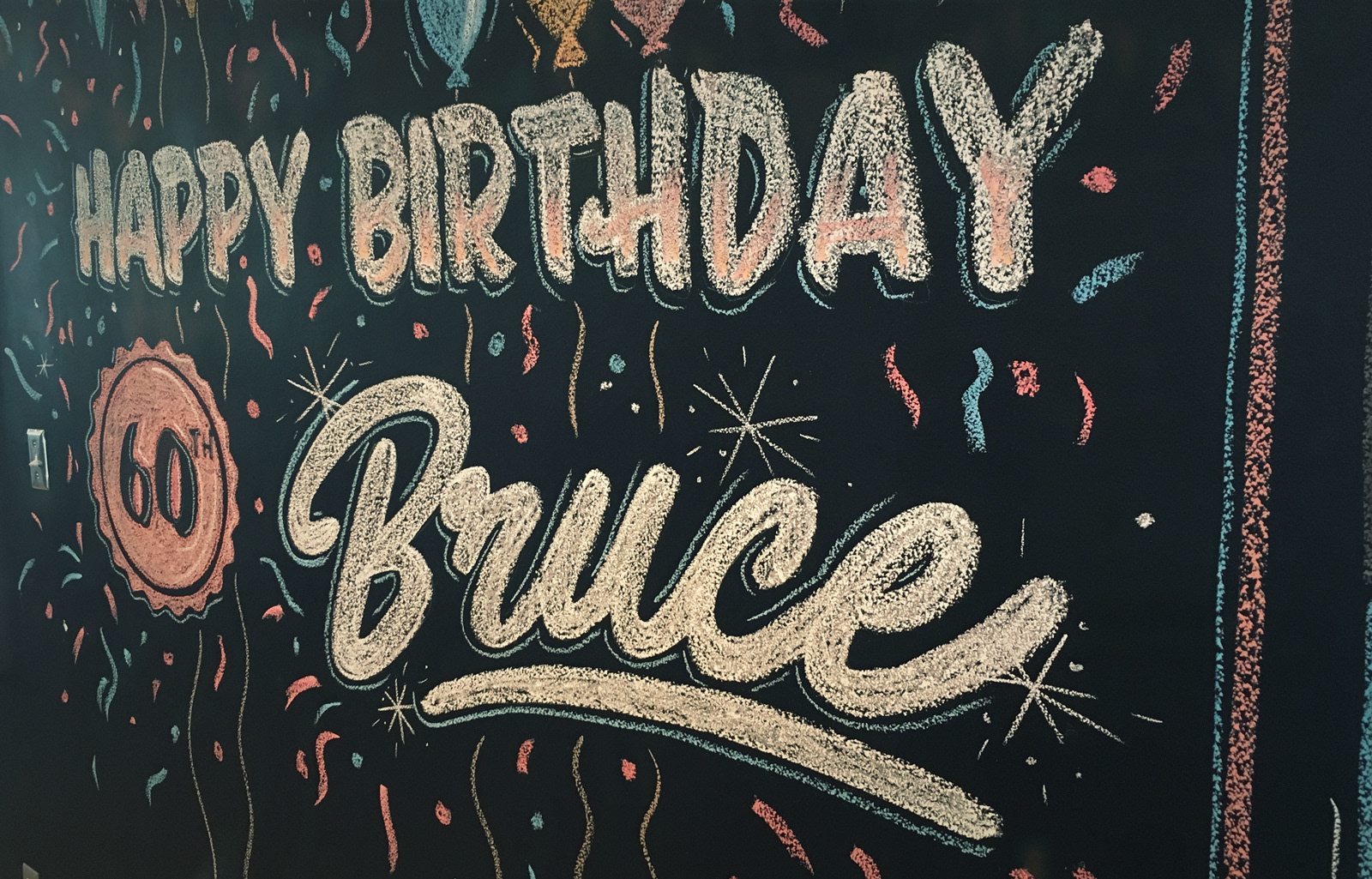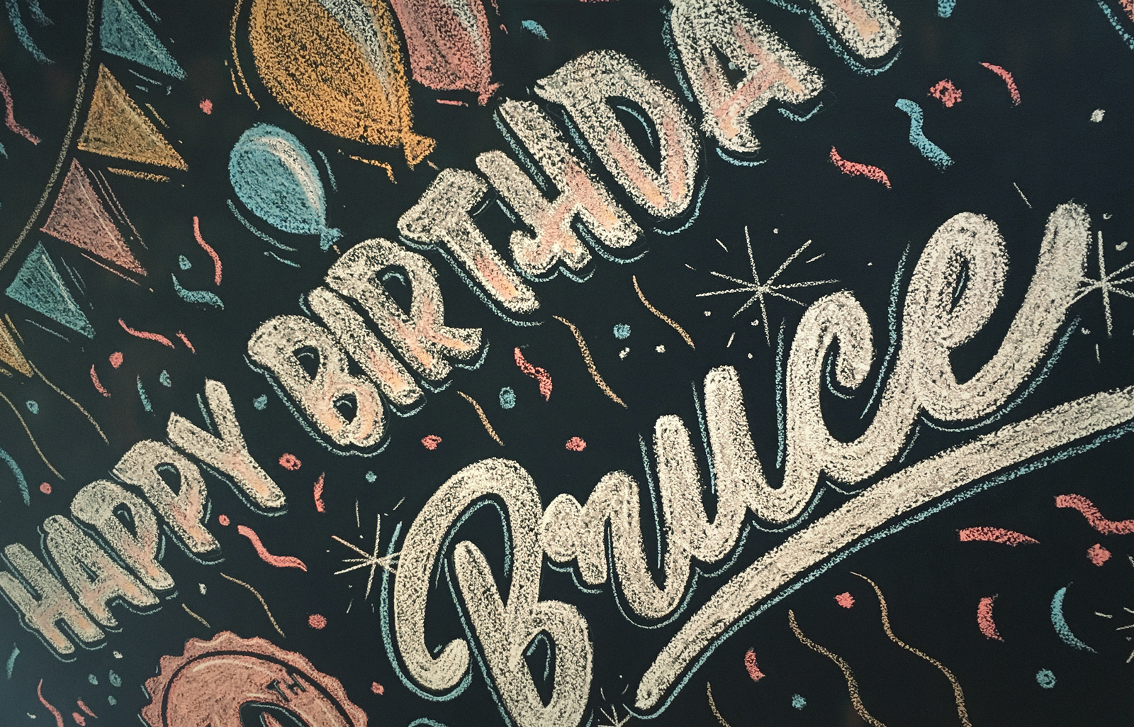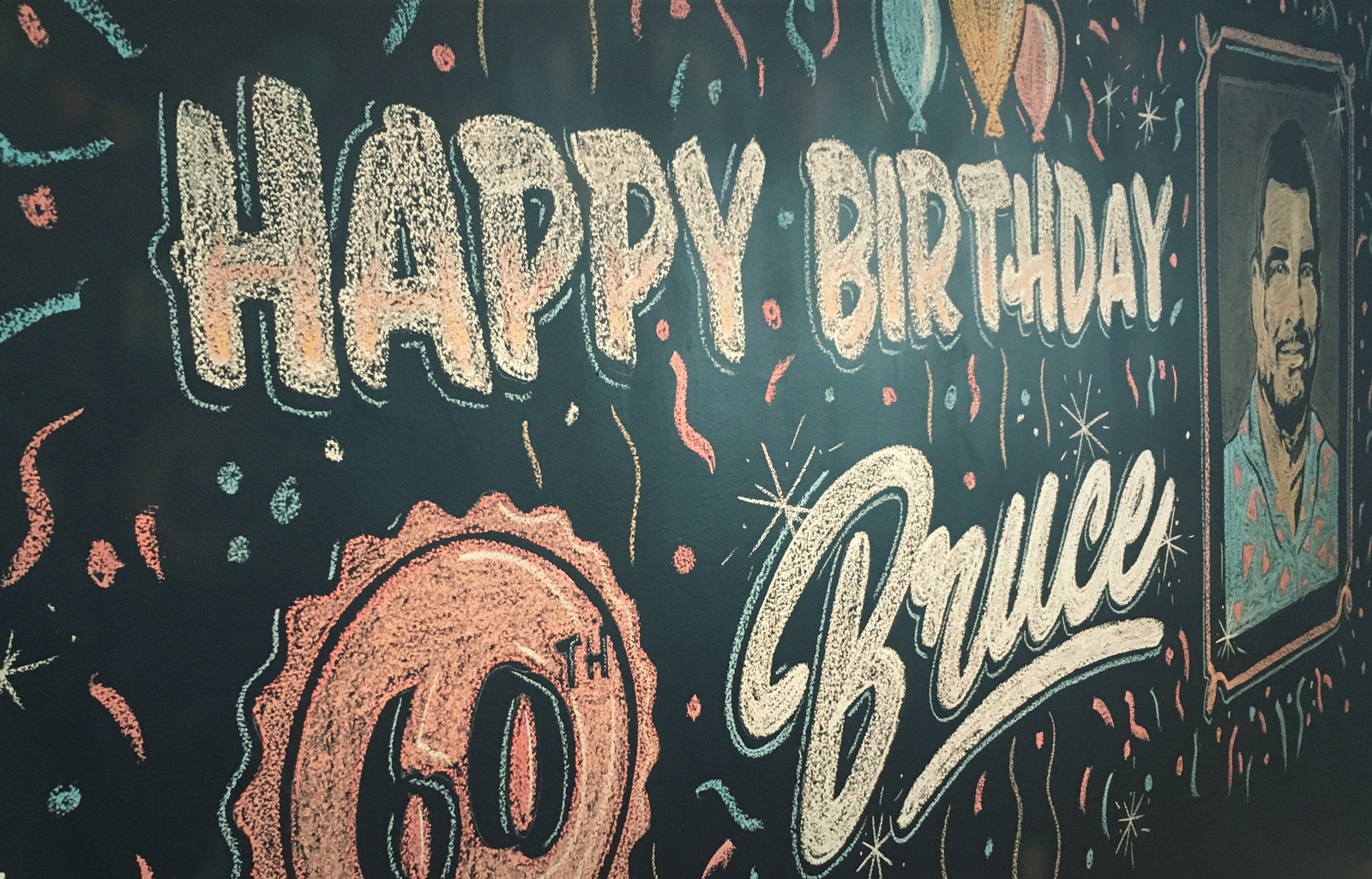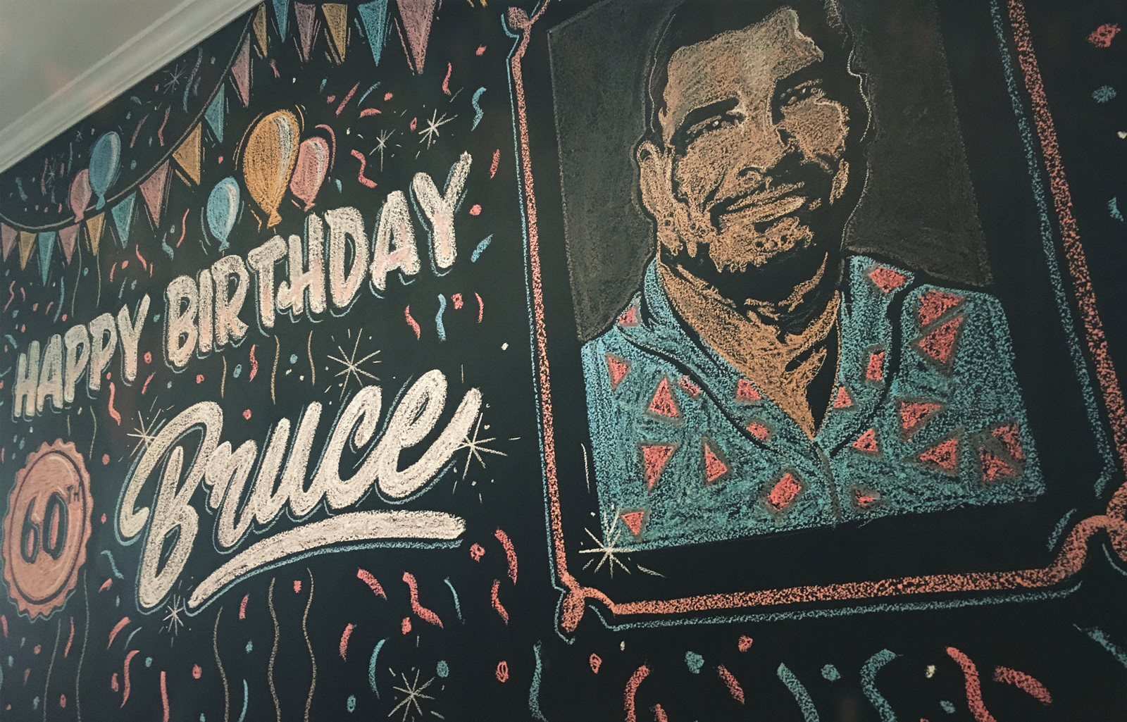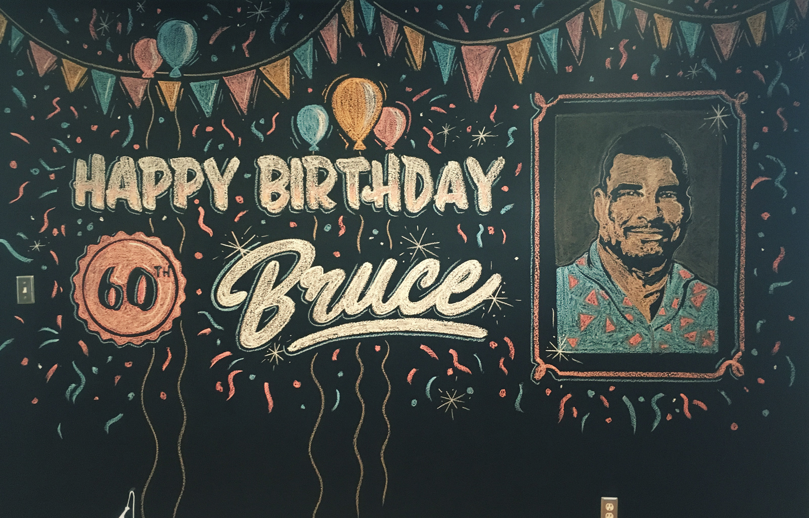 Temporary chalk mural for birthday party. This mural was done with a fun theme with a portrait and was purposely fixed to the top of the wall to be seen after the room's furniture was placed back into position.