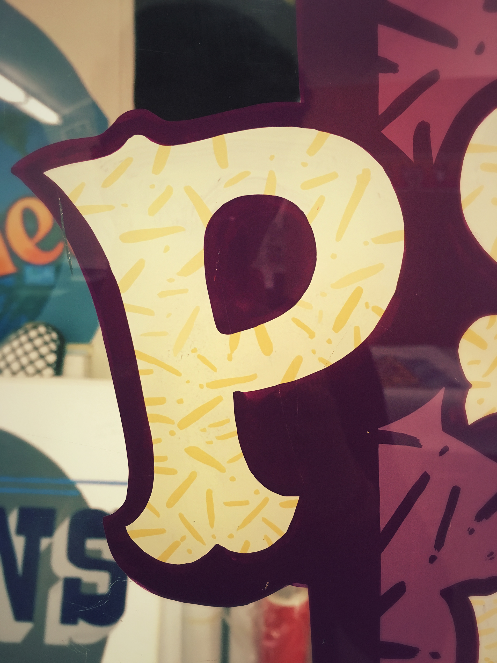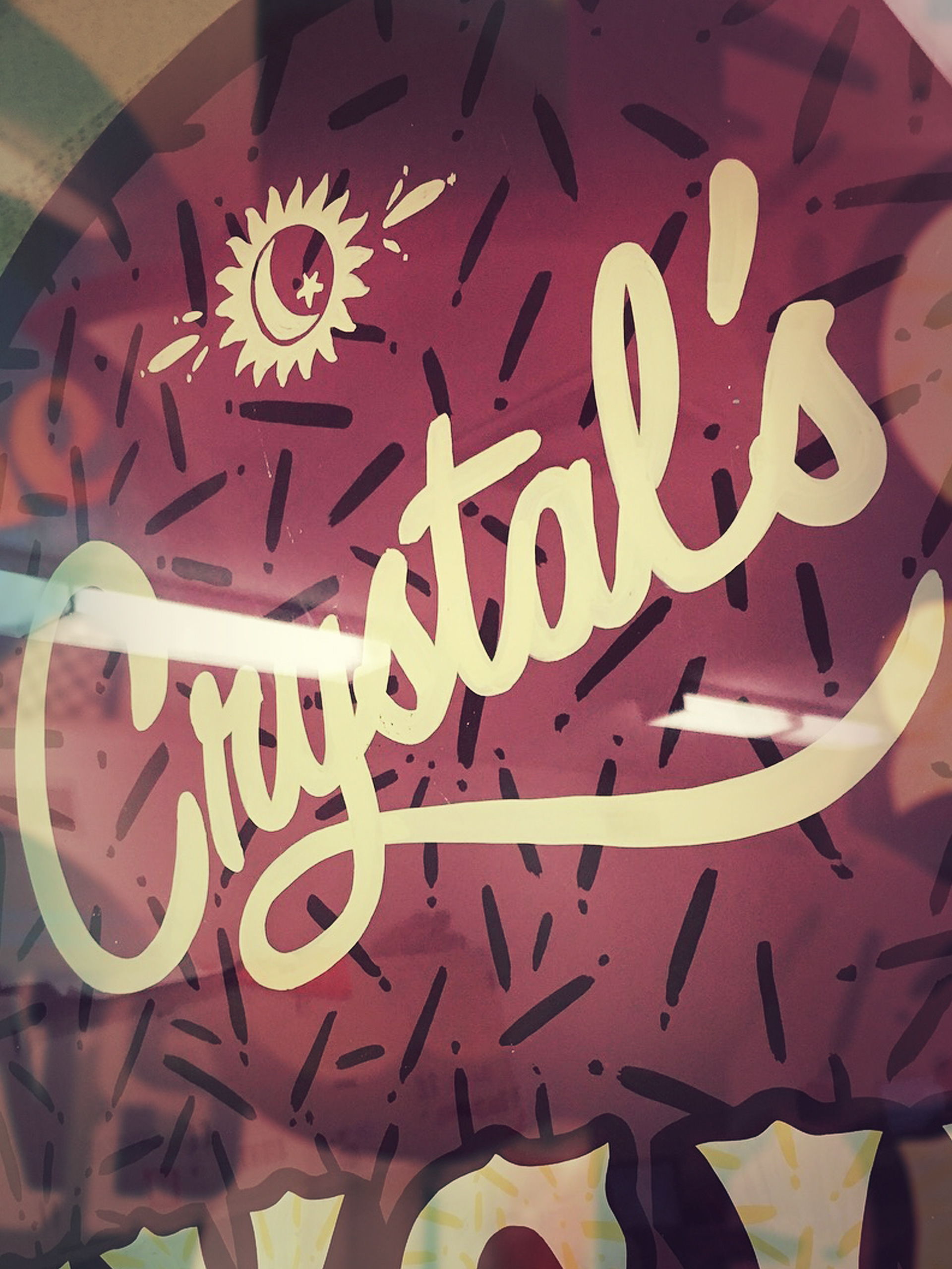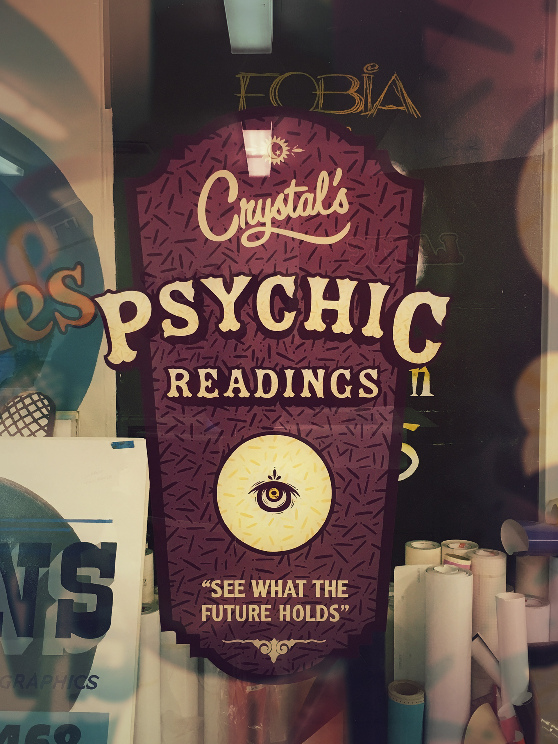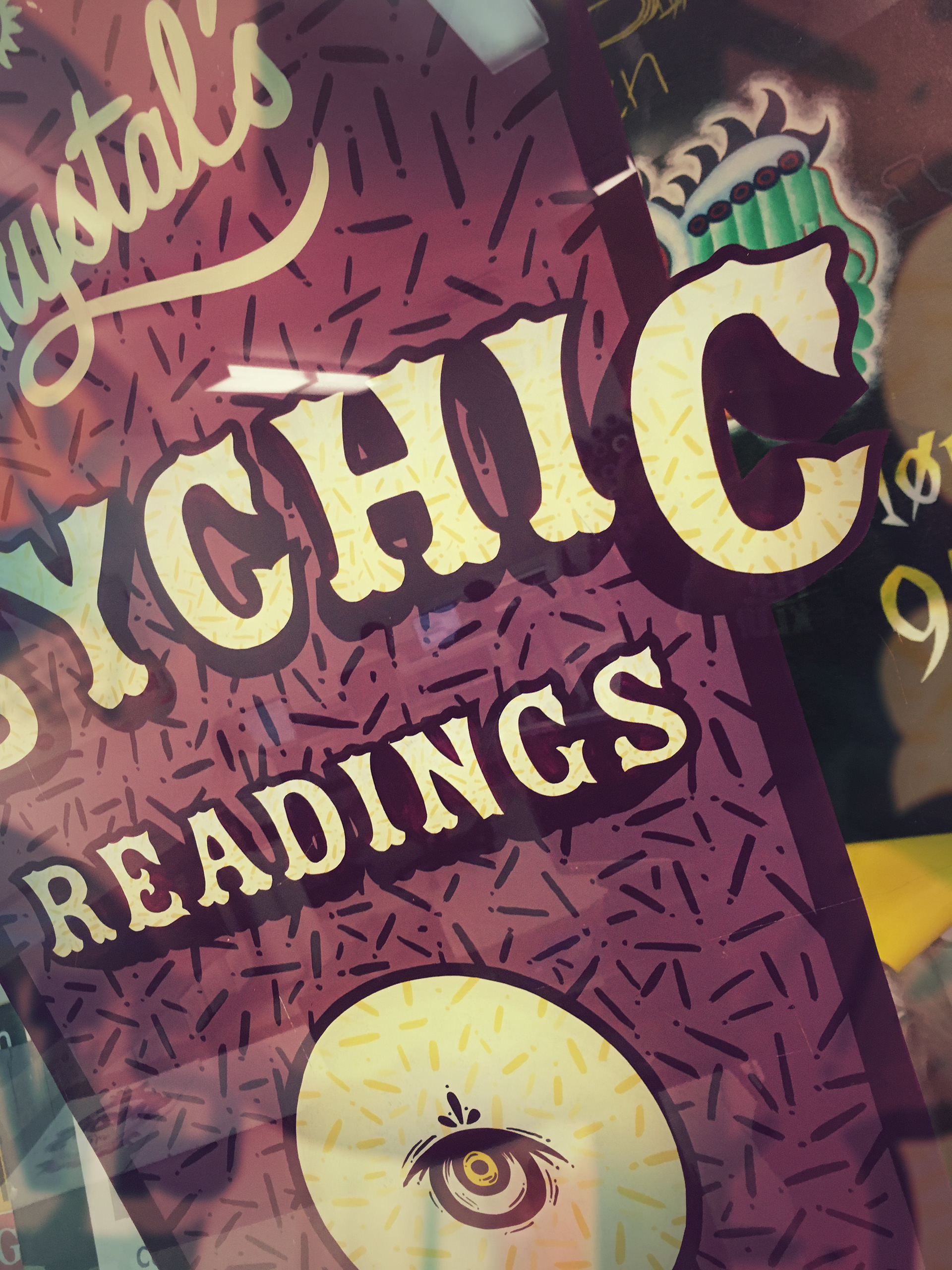 Window Sign painted in reverse with Oil-based lettering enamel. This Sign was designed to display vintage tarot imagery with a modern twist. All hand-painted.