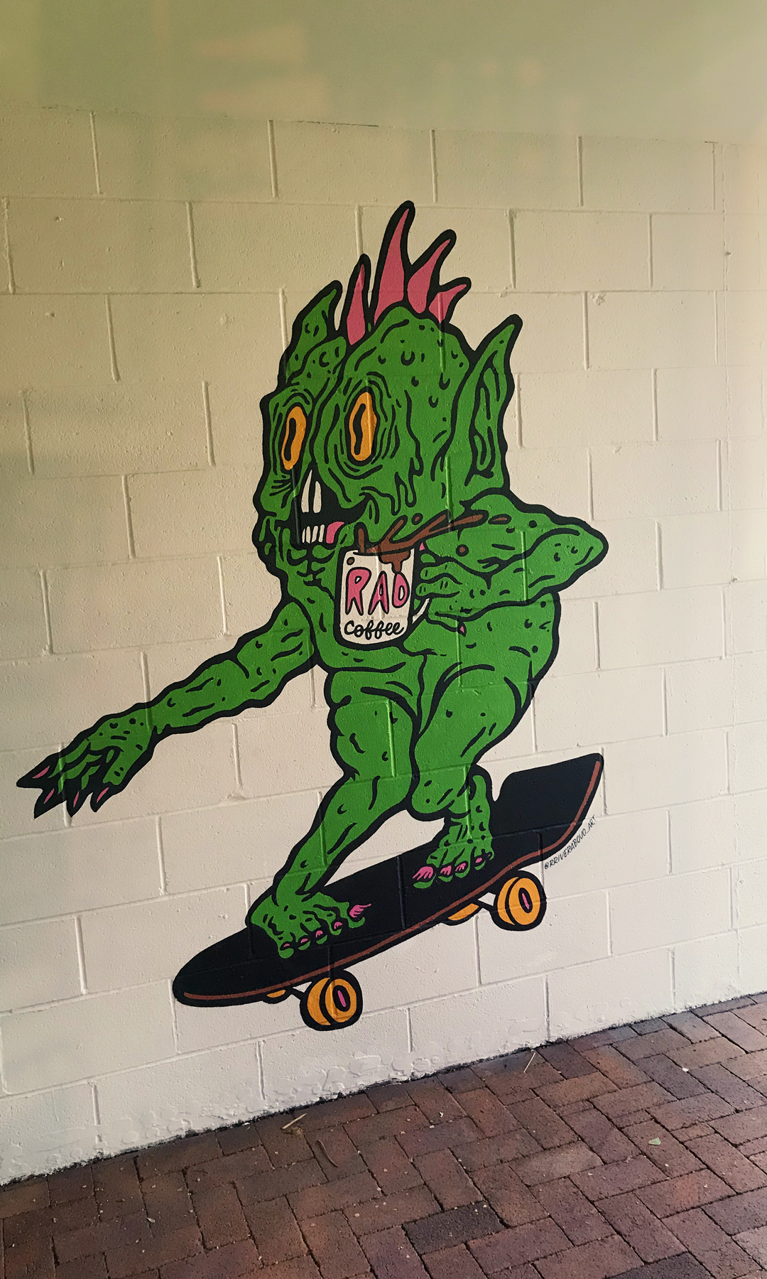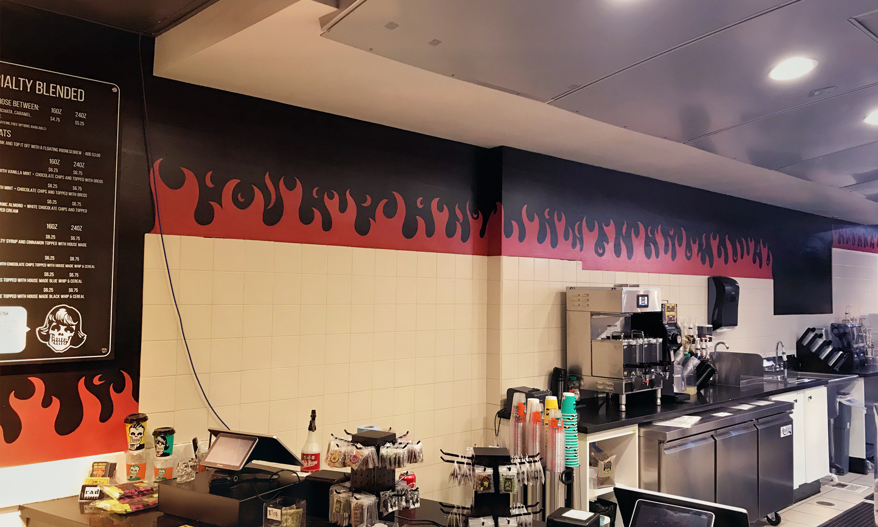 Commissioned by Rusty & Jade from Rad Coffee to paint a character designed by Rriverabovo_art for their new location in Covina, CA. Work also including hand drawing and painting hot rod flames all over the walls inside the location.