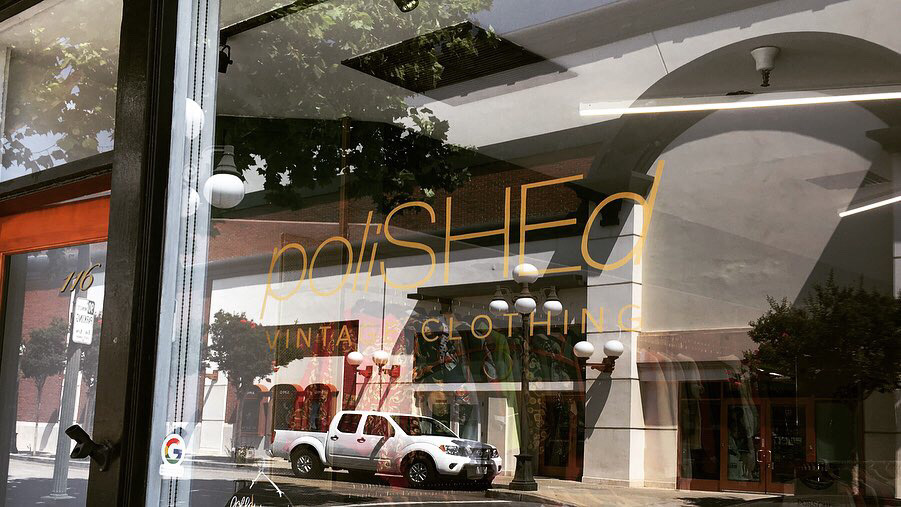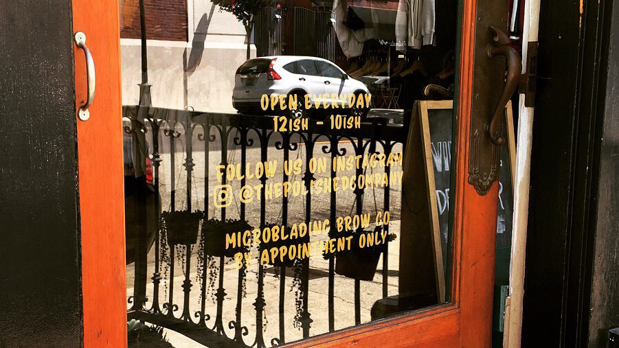 Simple yet elegant logo and business hours paint on glass for The PoliSHEd Company at their new store in Monrovia, CA.